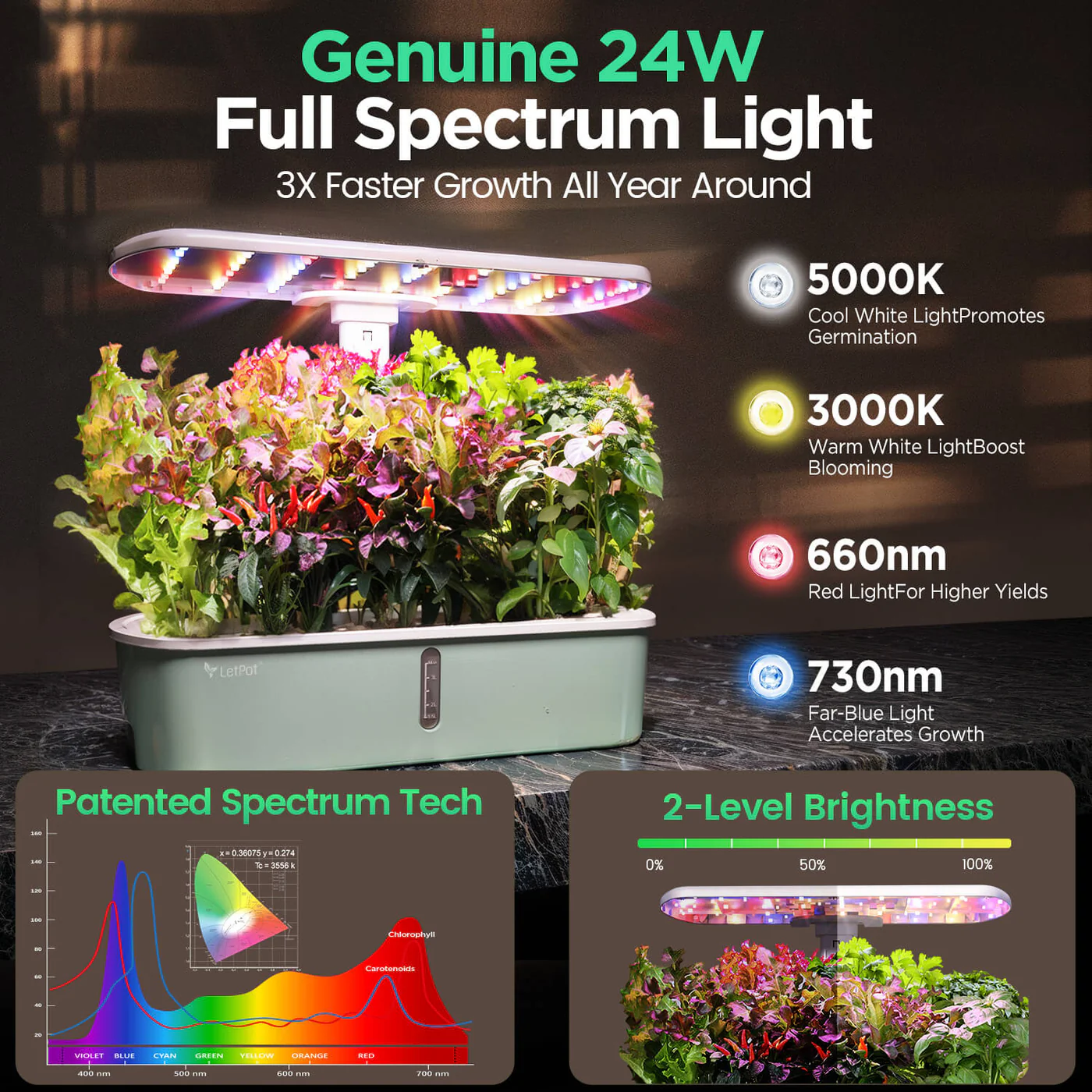 Dual Growing Modes: The powerful 24-watt full-spectrum LED grow light features two modes: one optimized for fruits & flowers, and another for veggies & herbs. This ensures your plants receive the perfect light spectrum for every stage of growth.